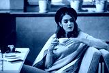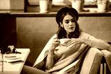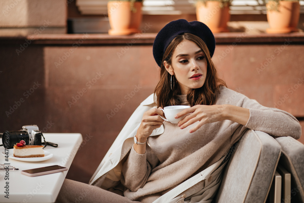 Charming young brunette with dark beret, beige jersey and trench coat, having breakfast, drinking coffee, eating cheesecake, at city cafe terrace during sunny day