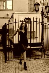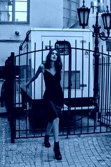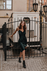 Full-length portrait of stylish young brunette in dark green silk long dress and high black shoes, with tattoo on body and bright makeup, posing outdoors