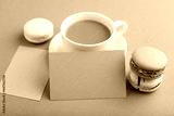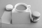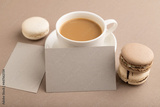 Gray paper business card mockup with brown and white macaroons and cup of coffee on beige pastel background. side view, copy space.