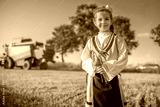 Girl with Bulgarian folklore costume at wheat field during harvest with combine by sunset