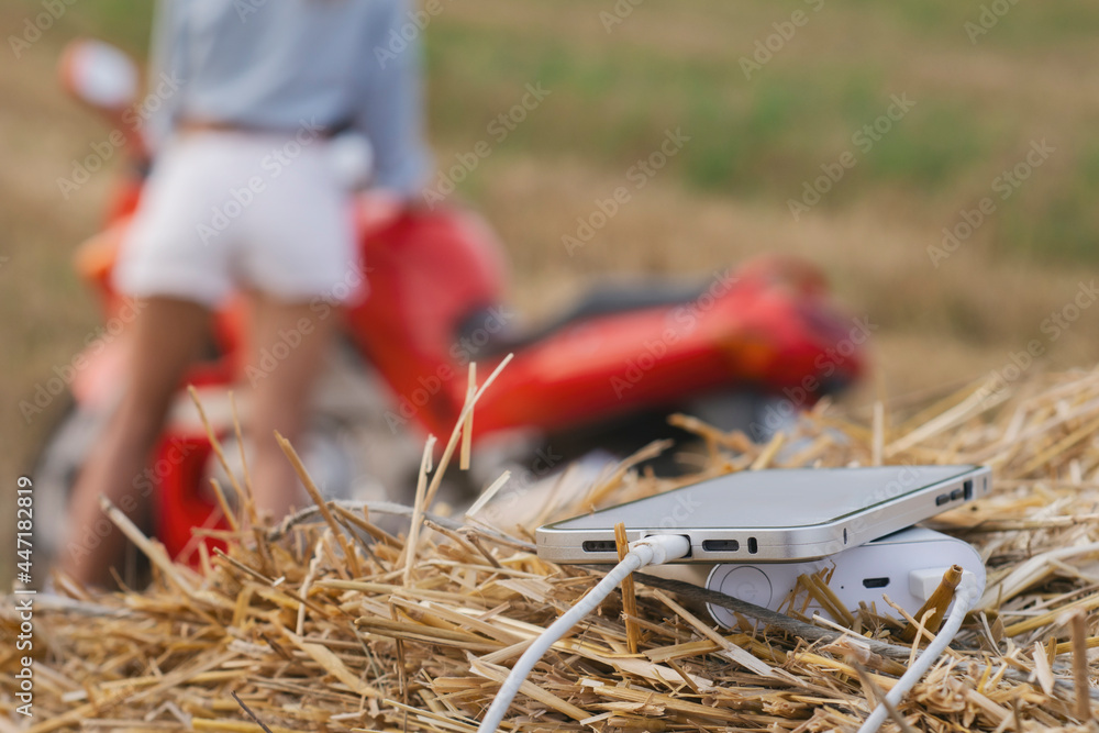 Smartphone close-up with a portable charger. Power Bank charges the phone against the backdrop of a motorcycle, a girl and nature.