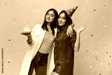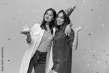 Attractive women in stylish oversized shirts pose with piece of birthday cake on pink isolated background with confetti.