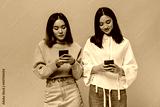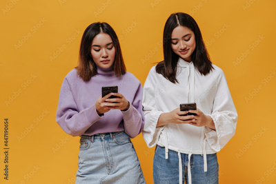 Girls massaging in cellphones on isolated. Brunette short-haired women in sweatshirts hold phones on orange background.
