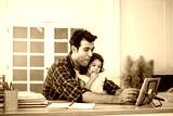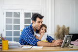 Young attractive father and little cute daughter watching the movie video or cartoon on the tablet and eating potato chips at home with happiness.