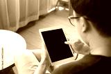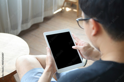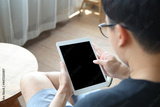 Overhead view man sit on table with using mockup tablet