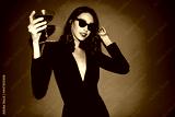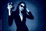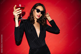 Pretty curly woman in sunglasses and black dress holds cocktail glass. Elegant lady poses on red background.