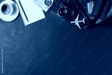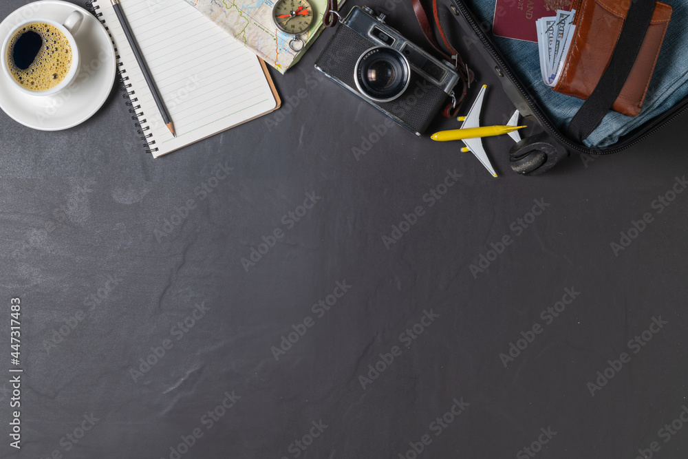 Prepare a suitcase, vintage camera, notebook, map and black coffee