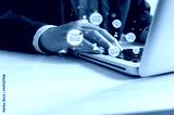 businessman hand typing on laptop keyboard checking email online. business technology on a virtual interface