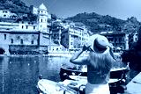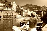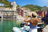 Holidays in Italy. Beautiful female tourist in the picturesque colorful village of Vernazza, Italy.