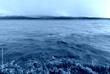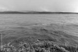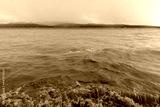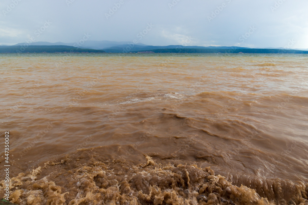 Muddy brown water with sand on the surface of the lake. Cloudy weather after storm