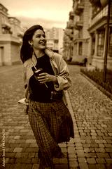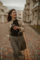 Happy brunette woman in checkered skirt, black top and beige trench coat smiles sincerely, holds coffee cup and walks outside.