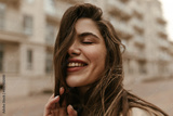 Happy brunette woman smiles sincerely. Close-up portrait of young beautiful lady in good mood laughs with closed eyes outside.