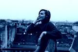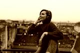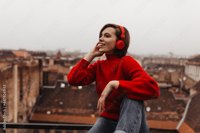 Cool lady in red sweater and jeans listens to music in headphones on balcony. Young woman looks at city from terrace.