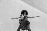 portrait multiethnic couple Caucasian young man carrying afro woman with open arms