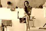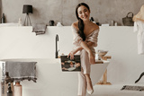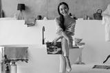 Charming happy brunette woman in linen beige pants and blouse smiles sincerely, holds fashion magazine. Asian lady sits on bath in bathroom.