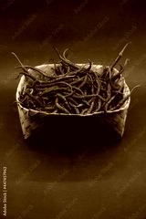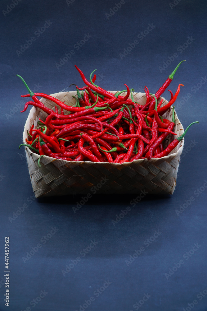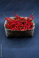 Red chili pepper in a bamboo basket isolated on a black background, focus selected