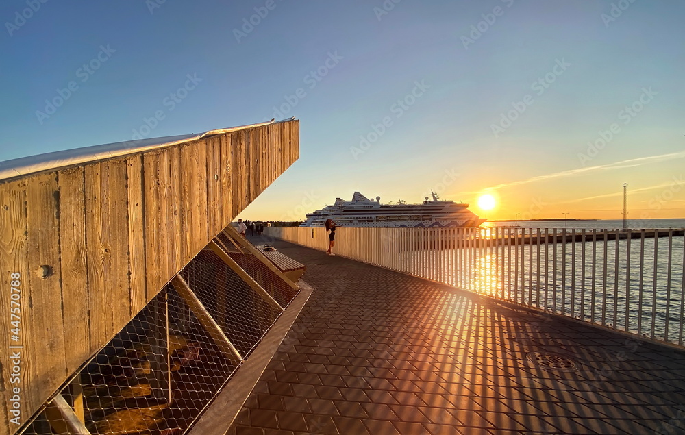 promenade pier in harbor sunset and sea water wave reflection people walk and relax modern urban architecture port of Tallinn Estonia Baltic sea panorama