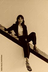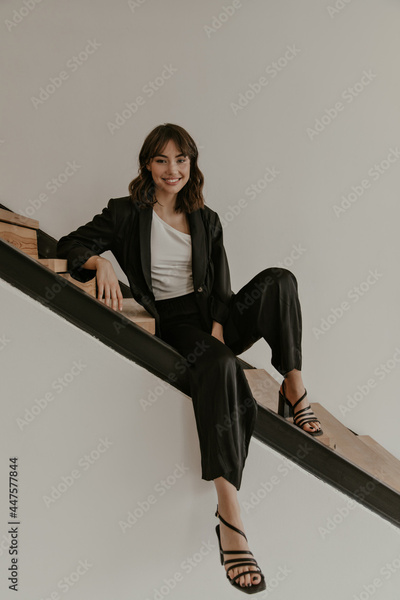 Cheerful attractive brunette woman in silk pants, black oversized jacket and top smiles, looks into camera and sits in relaxed pose on wooden stairs on white background.