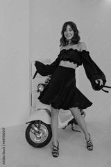 Curly attractive brunette woman in black trendy skirt and cropped top smiles widely and dances near moped in white room.