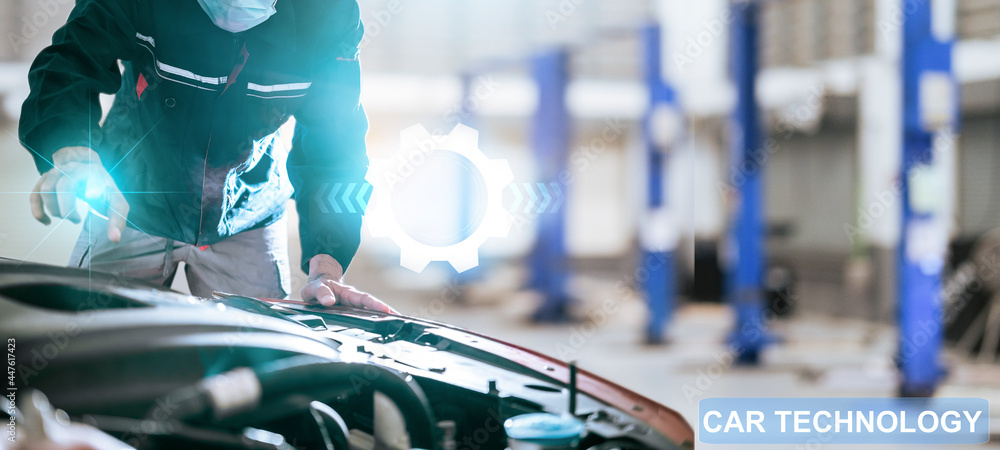Asian man car inspection application for service car for car futuristic vehicle graphical GUI interface intelligent. connected car. Internet display technician maintenance