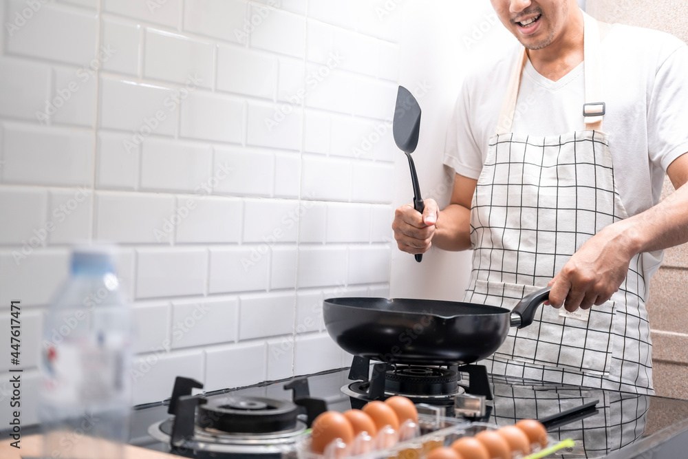 Asian chef fried eggs on pan to thai food in kitchen on gas stove The oil in pan boiling.Eggs and pork cooked. before serving to happy family to eat togetherness in home