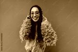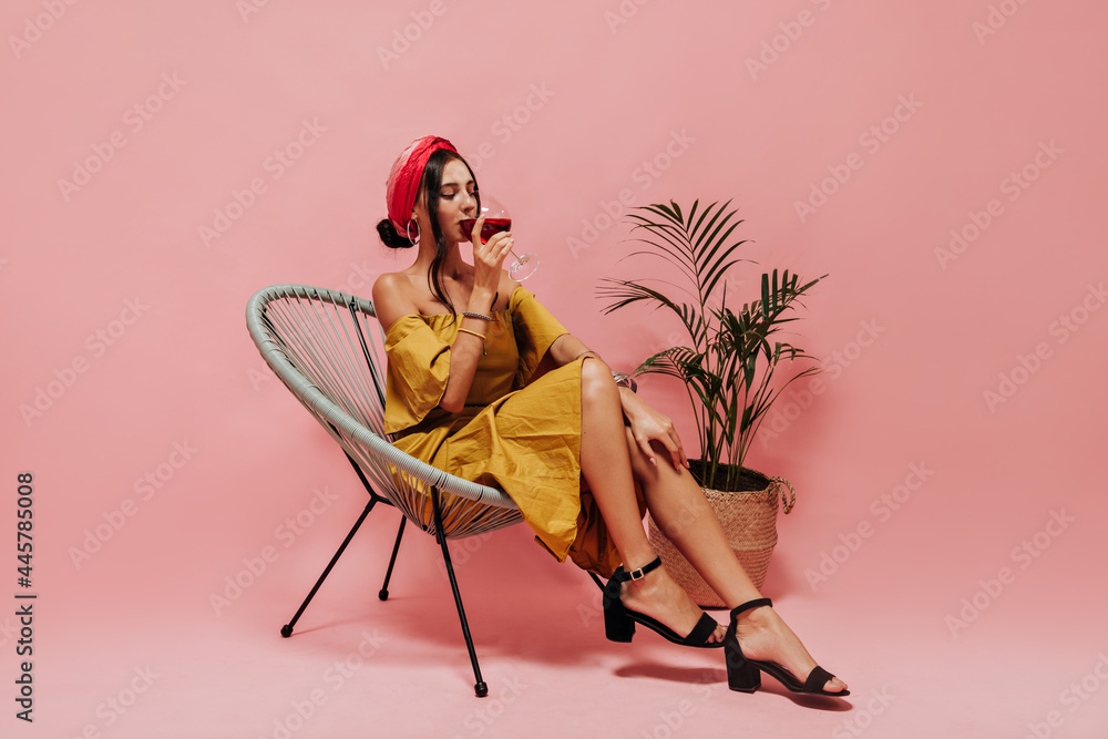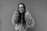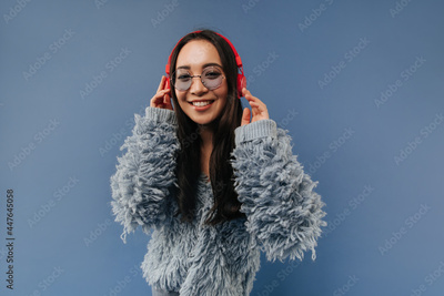 Trendy lady in good mood with black long hairstyle, red headphones and cute smile in stylish warm sweater looking into camera..