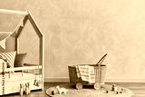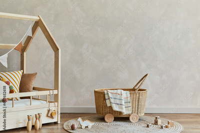 Stylish composition of cozy scandinavian child room interior with bed, rattan basket, plush and wooden toys and textile hanging decorations. Creative wall, carpet on the floor. Copy space. Template.