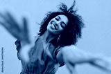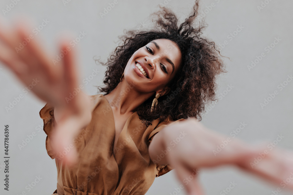 Curly dark-skinned woman stretches arms to camera. Young brunette lady in brown blouse smiles sincerely on grey background.
