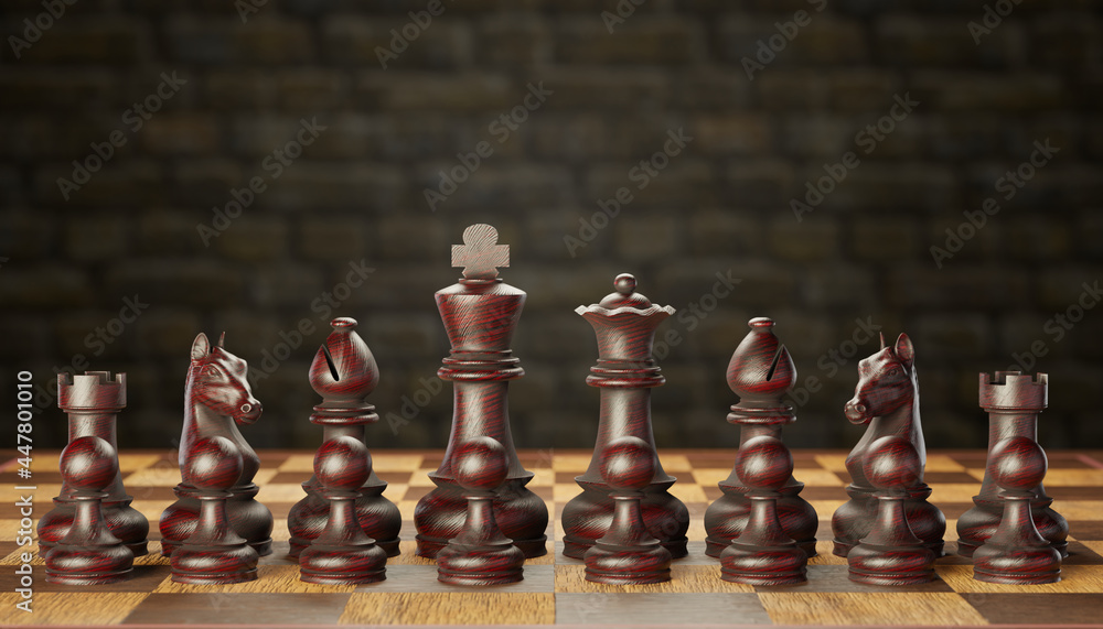 A set of dark wooden chess pieces placed on a chessboard in a brick wall background. The concept of business strategy planning. copy space for text or article. 3D illustration rendering.