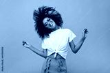 Emotional curly girl in light t-short playing her hair on isolated backdrop. Joyful woman in glasses poses on yellow background..