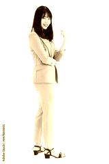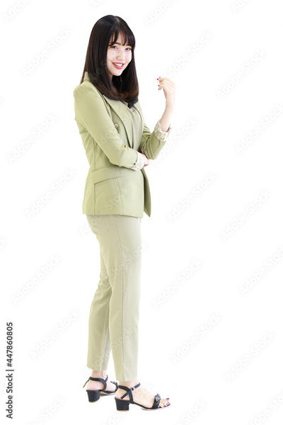 Vertical side view full-body portrait shot of attractive smiling young adult Asian woman in light green formal clothes looking at the camera and posing in the studio isolated with white background