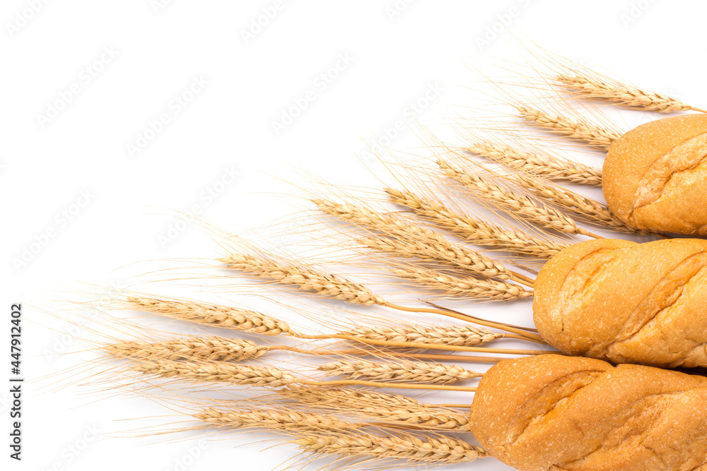 Delicious organic bread with ears of wheat isolated on white background - top view
