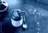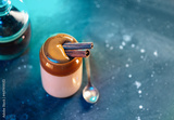 dalgona coffee is a stylish trendy Korean drink. Whipped fluffy coffee in a creative glass. Colored backlight background