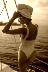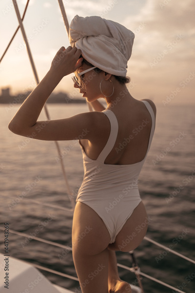 Charming woman with white swimsuit, stylish accessories and hair wrapped in light towel posing on background of sea and looking down during sunset