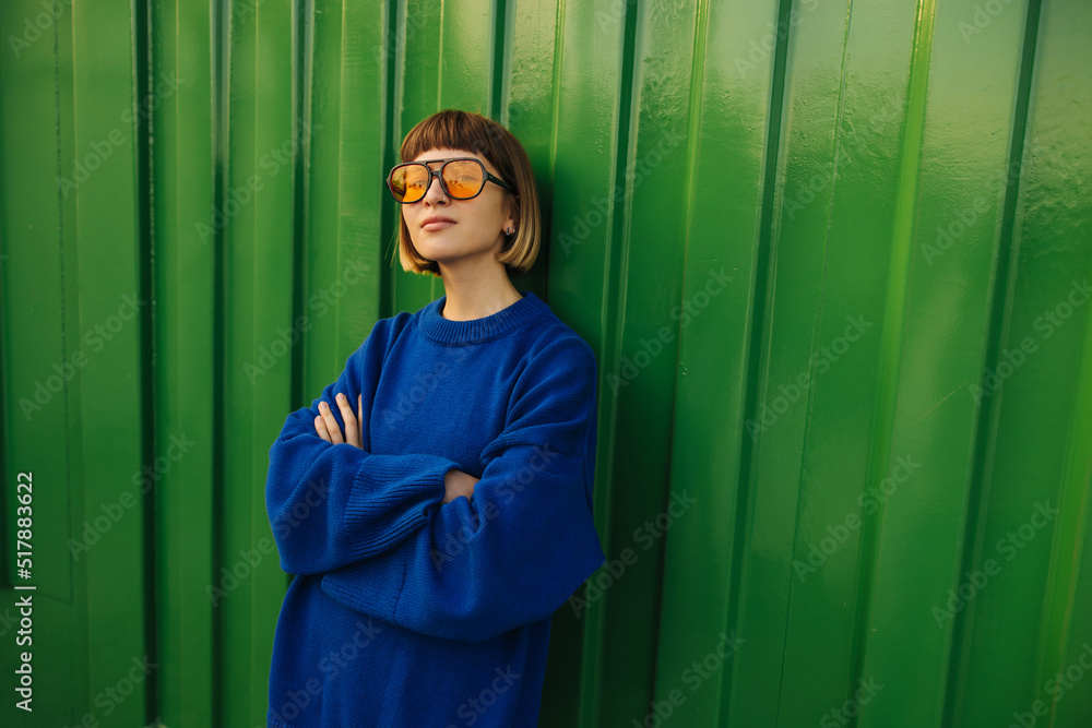 Cheerful pretty girl with closed eyes, long blonde hair, stylish accessories smiling and posing against background of pink sunset sky