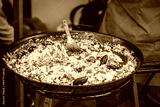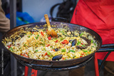 Large frying pan with cooked Spanish paella with seafood. Outdoors food, barbecue, Street food concept