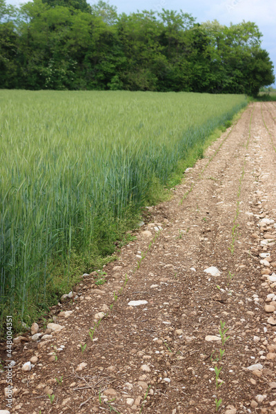 Green wheat plants growing in the field. Wheat cutlivation in northern Italy