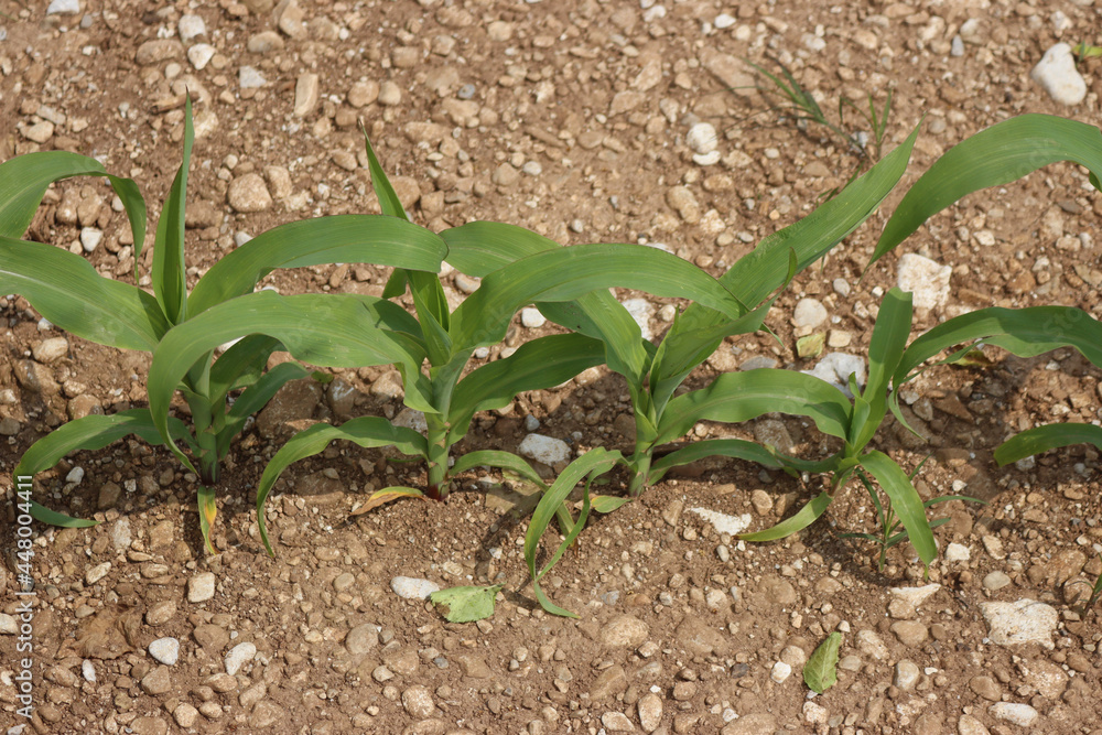 Young Corn plants growing in a row in the field on s sunny day. Zea mays