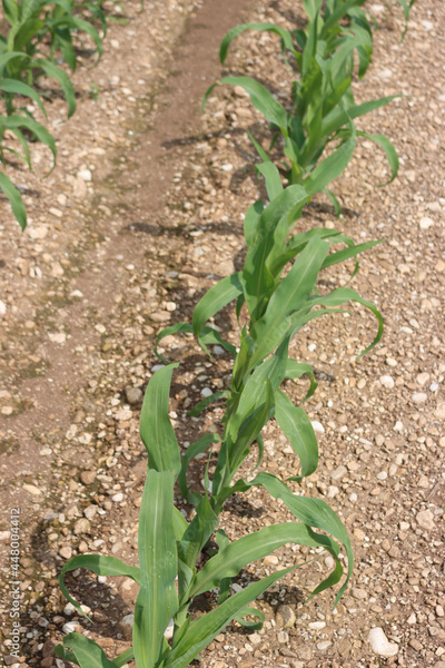 Young Corn plants growing in a row in the field on s sunny day. Zea mays