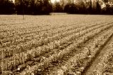 Green corn plants growing in row in the field on early summer in the italian countryside