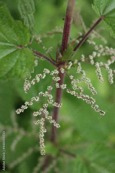 Close-up of Urtica dioica, plant. Common or stinging nettle with flowers on springitme in the meadow