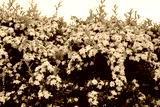 Pyracantha hedge with many small white blossoms on branches. Firethorn in bloom on summer