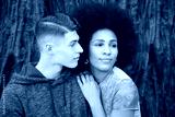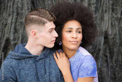 portrait young multiethnic couple Caucasian man and afro woman on dark background