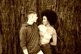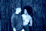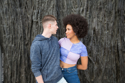 portrait young multiethnic couple Caucasian man and afro woman looking at each other over dark background
