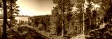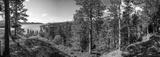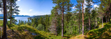 Panoramic view from a high hill on a beautiful taiga forest descending to the lake. Tall pine trees under blue sky. Norway.