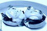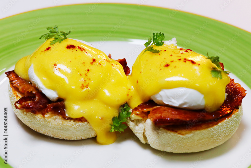 egg benedict on english muffin with pork or beef bacon with rich creamy hollandaise sauce