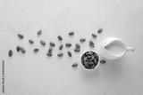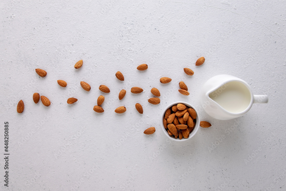 Almond alternative milk in a milk jug with almonds on a gray background, top view.