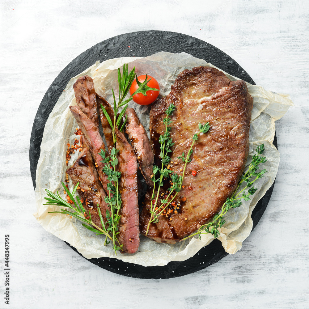 Beef steak. Veal, meat with spices and vegetables on a white wooden background. Flat lay. Top view.