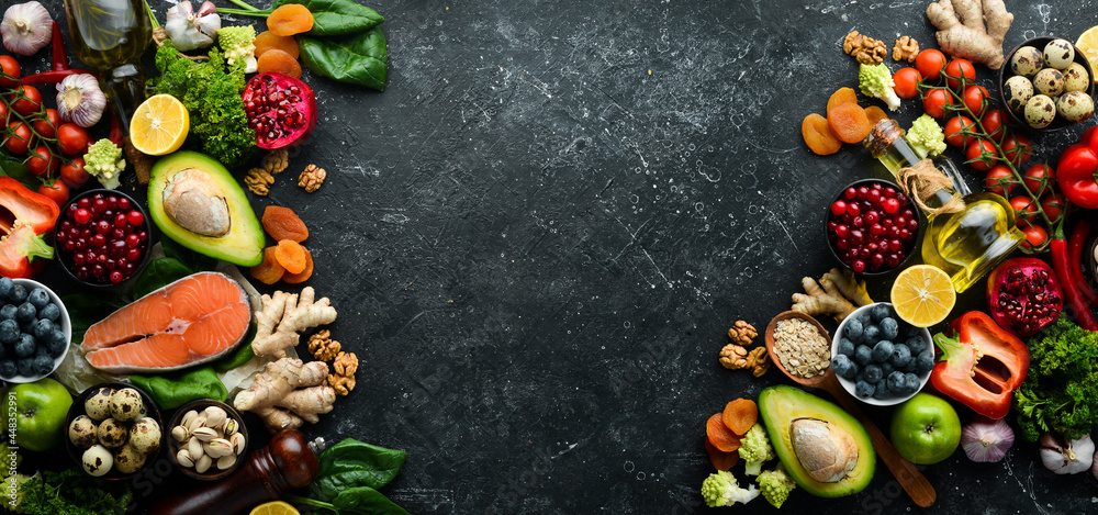 Healthy food background. Concept of Healthy Food, Fresh Vegetables, Nuts and Fruits. On a stone background. Top view. Copy space