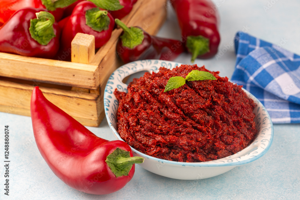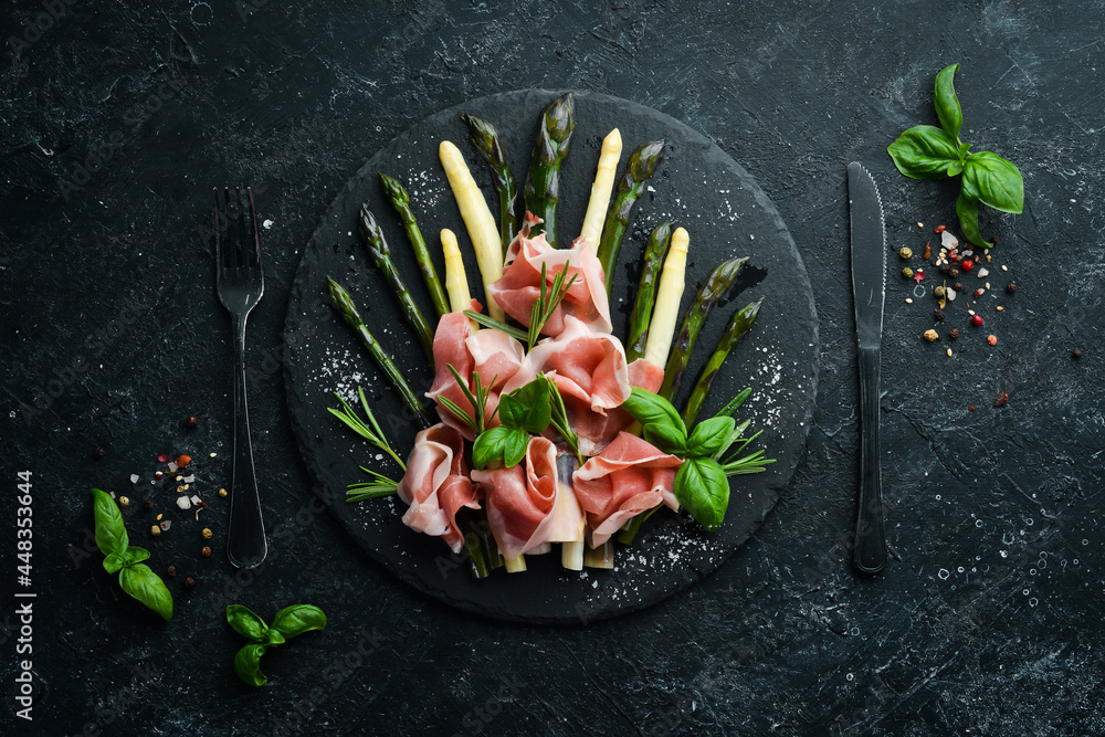 Prosciutto with boiled asparagus and spices on a black stone plate. Top view. Free space for your text.